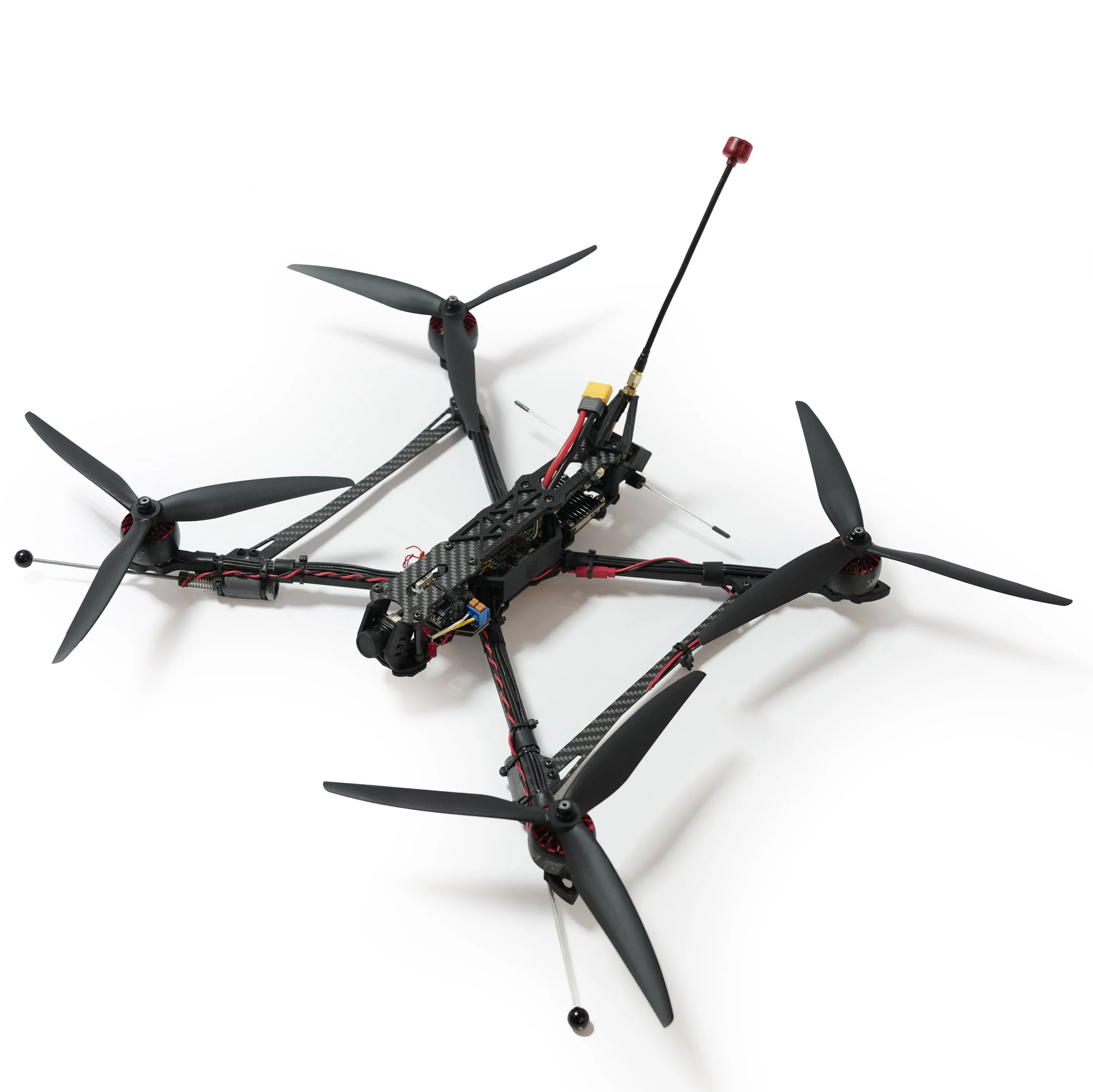First prototype — a lightweight, carbon-fiber quadcopter reconnaissance drone engineered specifically to house and flight-test our proprietary GPS-denied navigation system.